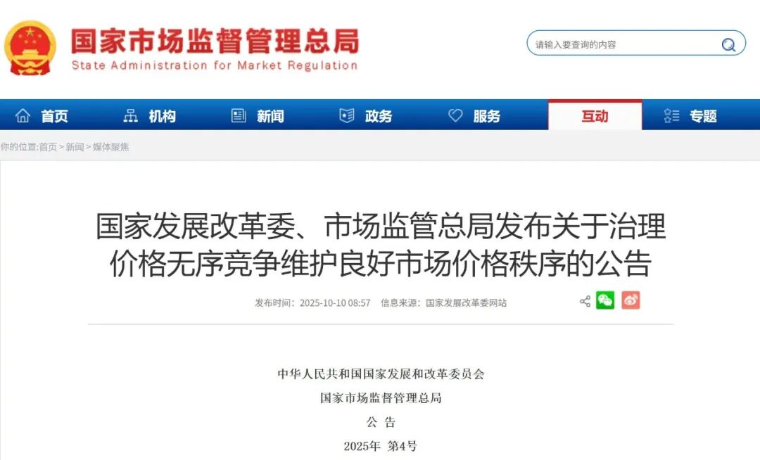 10月9日,国家发展改革委、市场监管总局发布《关于治理价格无序竞争 维护良好市场价格秩序的公告》(以下简称《公告》)。《公告》提出: