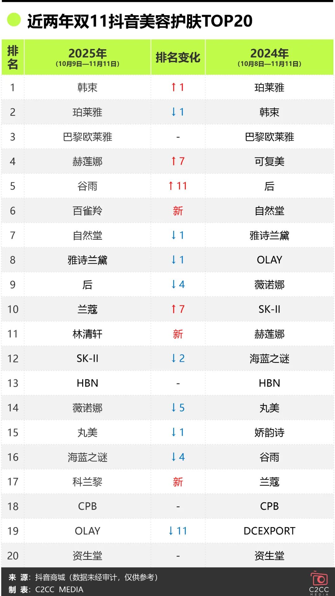 抖音双11美容护肤榜TOP3席位依旧被韩束、珀莱雅、巴黎欧莱雅锁定,与去年阵容一致。