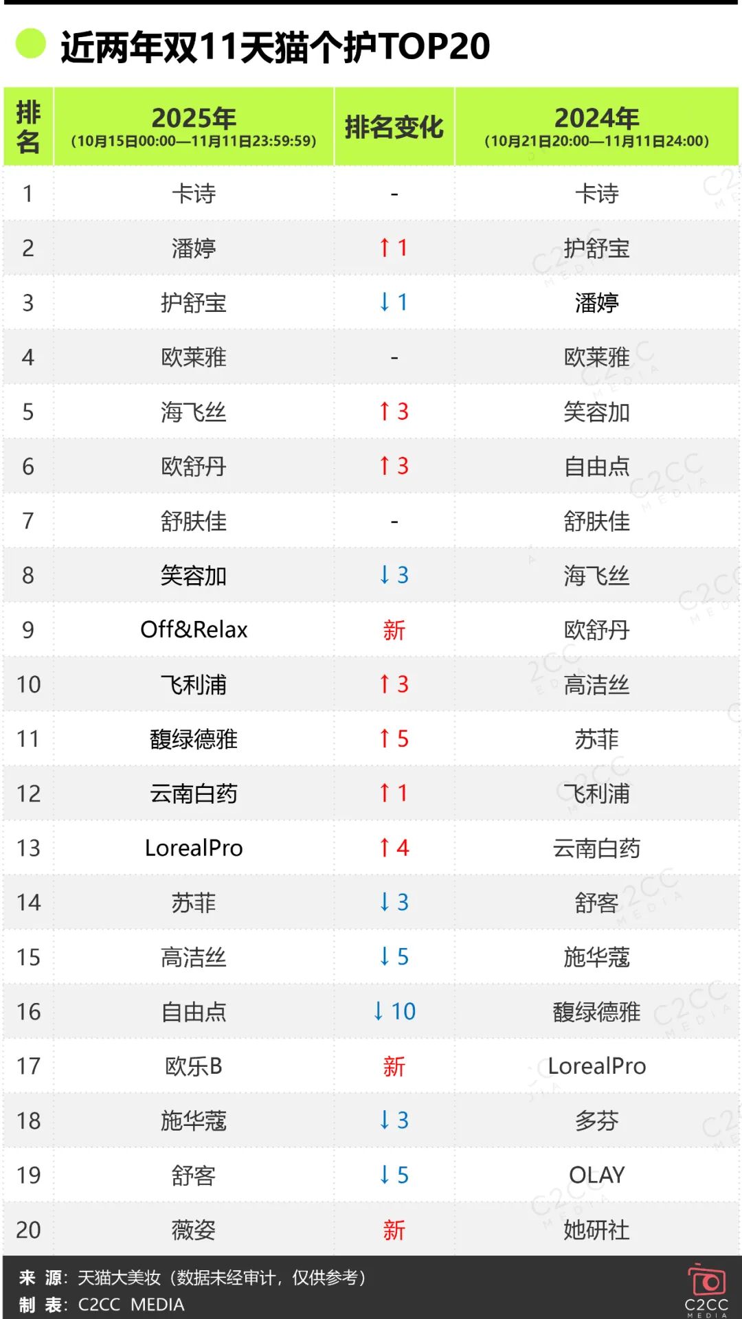根据天猫大美妆、抖音商城及网络公开资料,C2CC传媒×新妆整理了天猫美妆、个护、家清,以及抖音护肤,几大品类的品牌表现,其中的位次更迭与阵营变化,勾勒出行业发展的全新脉络。