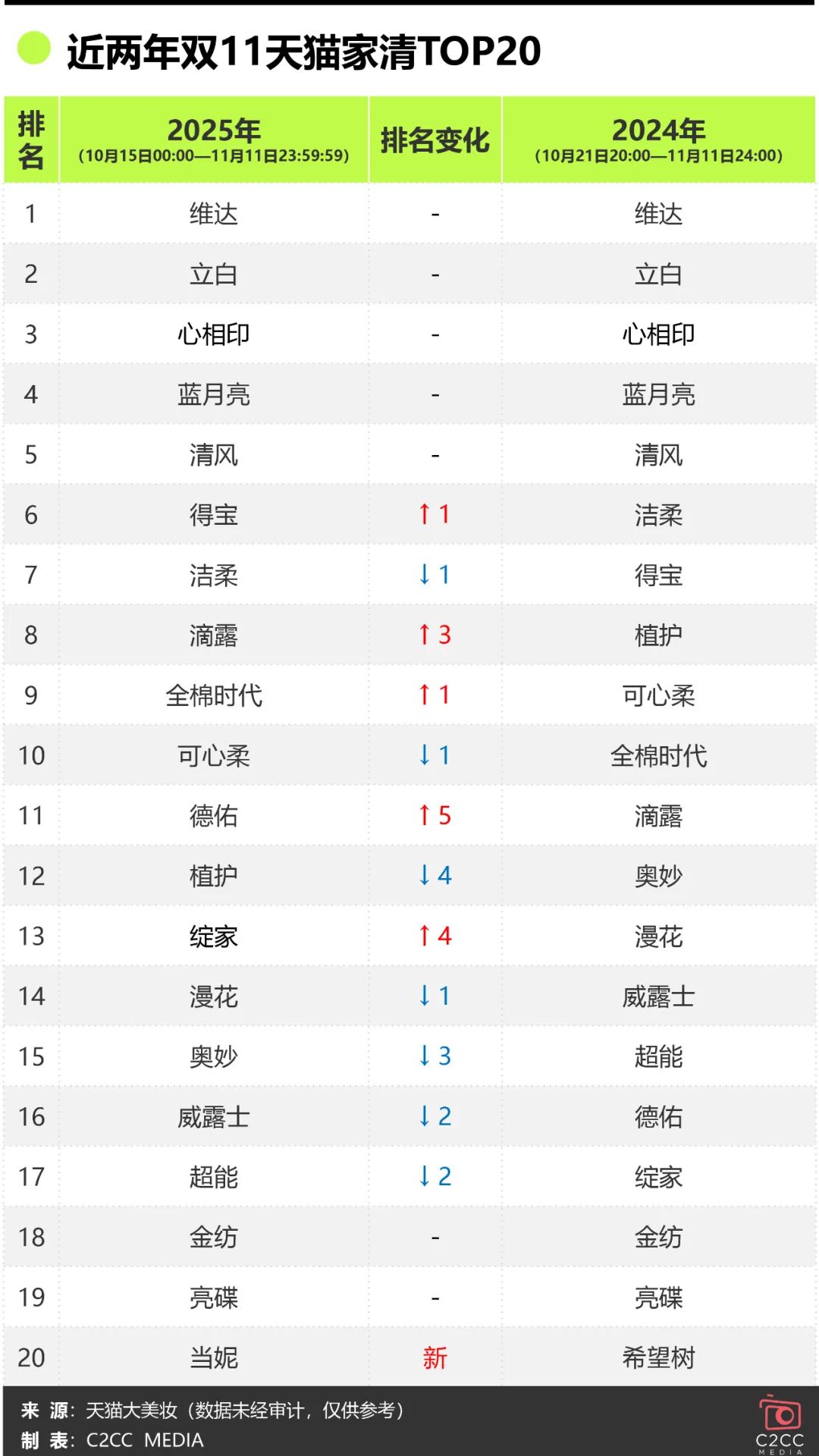 2025年家清TOP5品牌仍为维达、立白、心相印、蓝月亮、清风,与2024年完全一致,无任何位次更迭。
